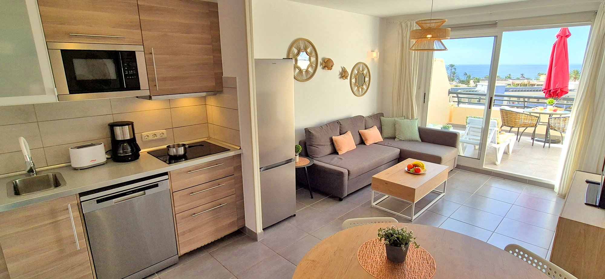 Vivienda vacacional BUENA VISTA para máx. 4 personas, equipado con salón, cocina abierta, baño, dormitorio y terraza con vistas al mar.